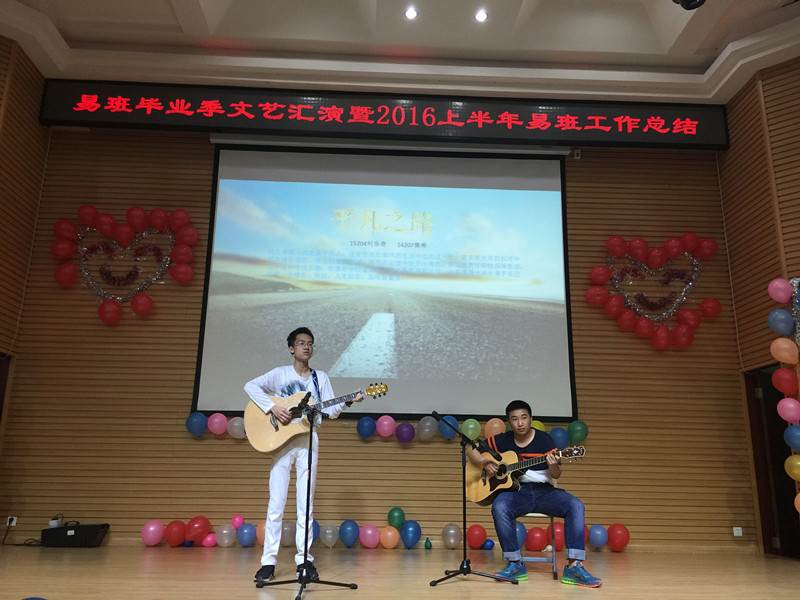 易班毕业季文艺汇演由15204班和14207班两名同学的吉他弹唱《平凡之路》拉开了帷幕,他们的歌声中刚中带柔,唱出了在青春年华里敢于拼敢于做的精神。