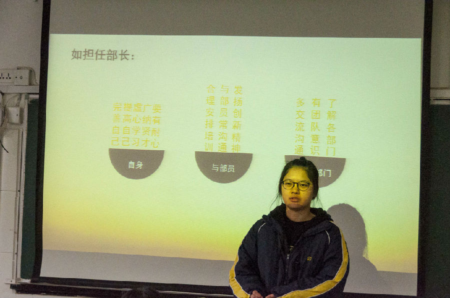 竞选以个人演讲的形式进行,每位候选人参照自己精美的PPT对自己的竞选作简短介绍和陈述。每一位参加竞选的同学,都充分的表现了自己,表述了自己竞选的职务及自身存在的优势,对未来工作进行了展望。