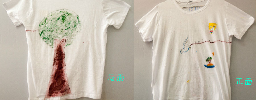 设计理念:T恤的意义在于这是一幅抽象作品。鸽子那条线是因为它想为环保做出一点贡献、椰子树代表阳光向上。