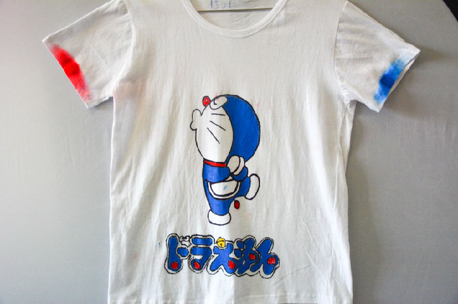 设计理念:夏日的燥热让人联想到春日空气中花草的芳香,而桃花就在这燥热的季节中增添一种小清新。桃花的制作我们是用橡皮刻出画的形状再印在衣服上,龙猫无脸男这个可爱的动漫人物在当今颇受大家的欢迎,所以我们则是把他们画在了衣服上,而龙猫、无脸男的特点就是守护他人;所以穿上这件衣服就会有一种被人守护的感觉。因为入夏时,桃花的凋零所以画上桃花就如同龙猫、无脸男守护者将要凋零的桃花。