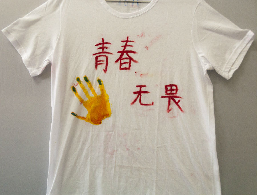 作品简介:我们的作品是简简单单的在T恤上只有“青春无畏”四个字。还有一个手掌印。