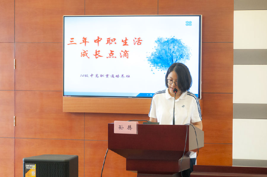 转段典礼分为成长篇、感恩篇及展望篇。转段典礼第一篇——“成长篇”,由1409班康亚菲同学带领大家回顾三年中职生活成长的点点滴滴,她用饱含深情的言语引领同学们忆了三年里丰富多彩的生活,用欣慰真挚的情感梳理了同学们在学校里参加过的学生管理、团学活动,用满怀希望的话语鼓舞同学们准备好迎接新的挑战。