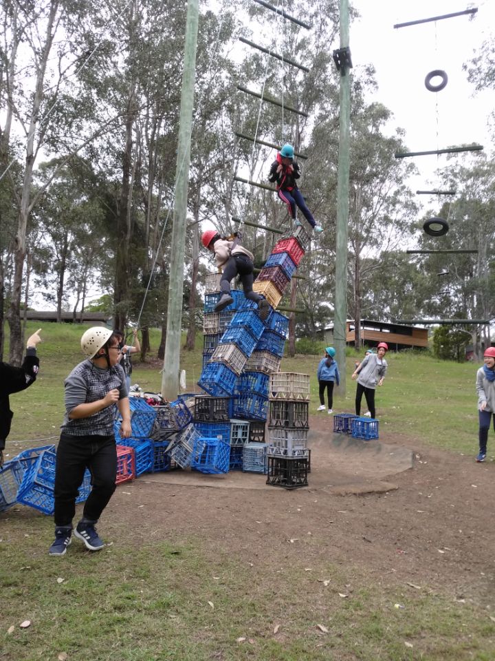 这是野营的第一项活动,堆箱登高。活动规则是每次选出两人系好安全带,作为攀登者,踩在伙伴们搭好的箱子上慢慢向上爬。按最终踩到的最高的箱子层数算作最终得分,限时10分钟。