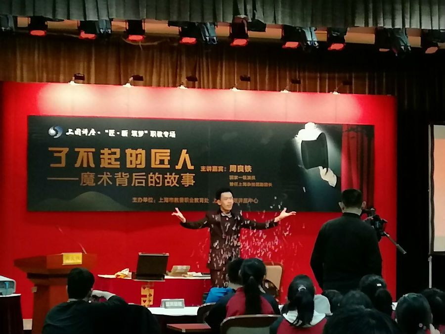 316下午,我校16级数字出版专业学生随老师一起来到上海图书馆参加周良铁先生的“了不起的匠人——魔术背后的故事”讲座