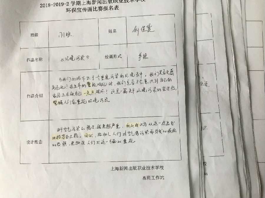 活动报名方式由各班易班班长汇报各班参赛人数,并至易班工作站领取了“环保宣传画”报名表,各班易班班长下发至各班参赛同学,填好报名表交至易班工作站,各班同学踊跃报名参加。