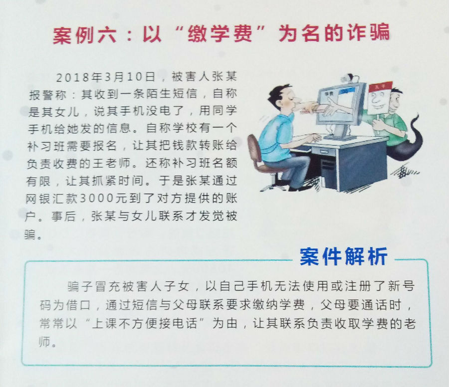 警察叔叔告诉我们,家长也是被诈骗犯重点入侵的对象。有些家长接到诈骗电话发现诈骗犯所描述的信息与自己的孩子相符,诈骗犯谎称其孩子在学校出了事故,就慌慌张张的跑去银行向其汇款。这是不正确的行为。如果接到类似诈骗电话,我们一定要先多方确认,如果发现双方信息核对不了,那就一定是诈骗犯在作案了!