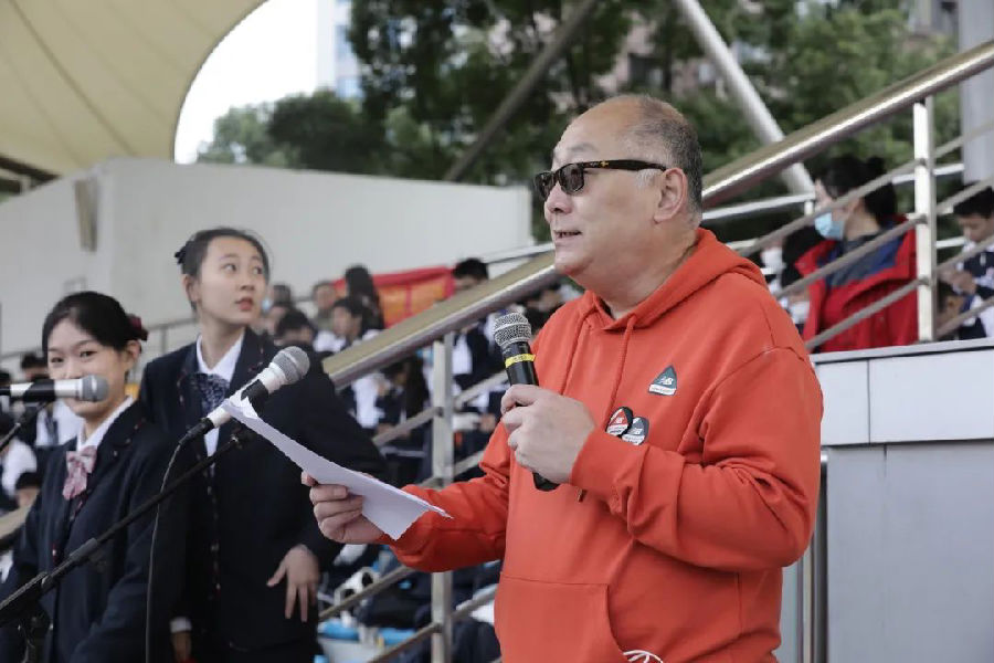 运动场上队伍整齐排列完毕,李小华校长开始致辞。他感谢为筹备本次运动会付出了辛劳的体育组全体教师、德育处老师以及其他相关工作人员,感谢到场赞助的兄弟单位的专家裁判,预祝运动会圆满成功。升旗仪式后,汪志颖书记宣布运动会开始。