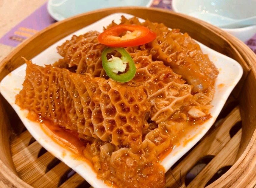 这道菜味道其实很不错,很符合大部分人的口味,我朋友更是极为喜欢。这道菜的食材很好,能感受到食材是很新鲜的而且金钱肚十分厚实,但是每份只有五片,量称不上多,但配合其他的菜品来说是刚刚好的。金钱肚蒸的有些偏烂,所以可能比较入味,鲜是鲜美但对我来说嚼劲不够,不过总体上来看还是很不错,挺值得一点的。
