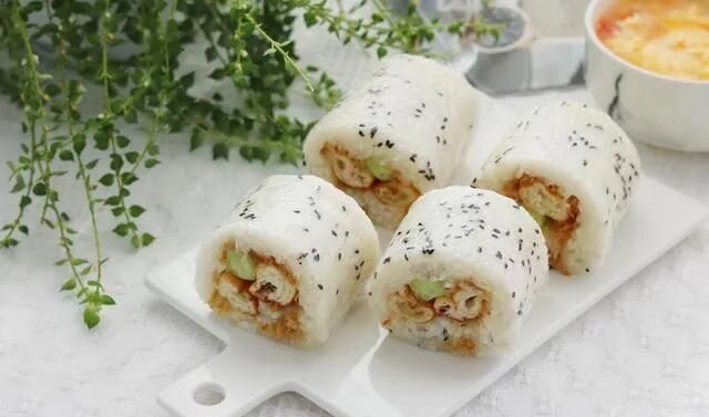 粢饭团,又称“糯米包油条”,是一种流行于江南地区的地方小吃,在香港又称为粢饭。是上海早餐的“四大金刚”之一,一般会配着豆浆享用,一般会有咸、甜两种口味。香软馥郁的糯米饭,包裹住刚炸出来的浓香酥脆的油条。此外,还会根据口味不同,添加肉松、榨菜、火腿、海苔、白糖、芝麻、黄瓜等配料。这种大饭团,饭量大的一般一个就管饱;饭量小的,吃上小半个,一上午都不觉得饥饿。