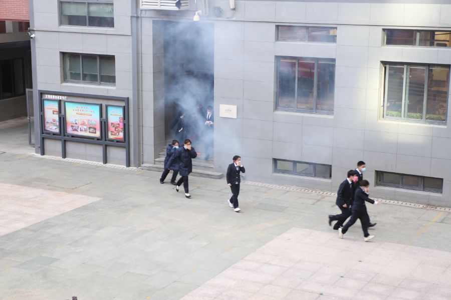 演习当天,德育室通过广播就安全疏散的注意事项向全体师生做了重要提示。随着警报声的响起,演练正式开始”。各班学生听到警报声后,按照预先设定好的路线和顺序从教室撤离。师生们手捂口鼻、弯着腰,紧张而有序地沿着消防通道迅速转移到学校操场安全地方。在规定时间内,全体学生到达集合地点,班主任清点班级人数后,各班班长向现场指挥报告人数。