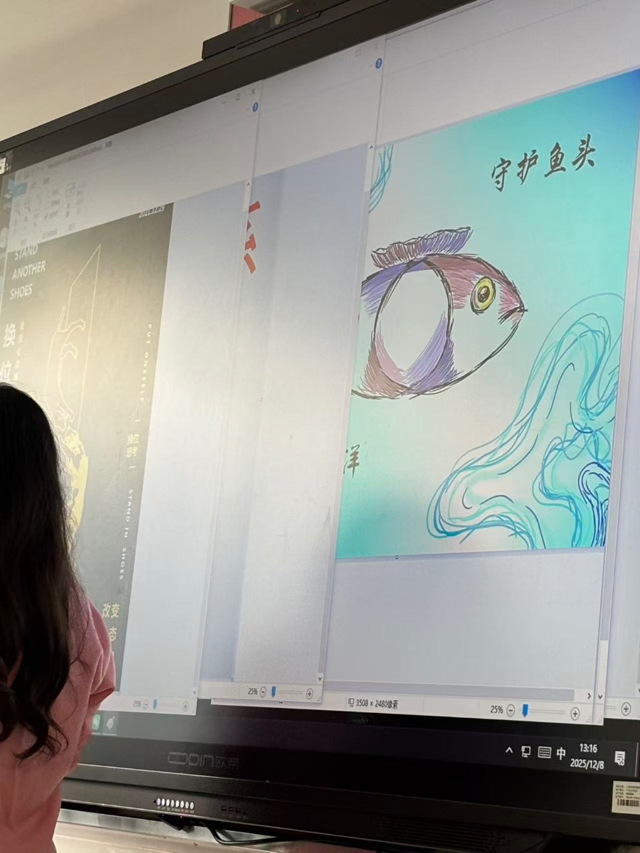 看着这幅以鱼头为主体的作品,灵动的线条勾勒出水流的动感,深浅不一的蓝绿色铺展出海洋的底色,鱼头的色彩搭配既大胆又和谐,简单的画面却藏着创作者的巧思。老师引导我们分析画面的构图逻辑,讲解如何用图形语言传递情感与主题,让我明白看似随性的线条和色彩,背后都有设计的思路。