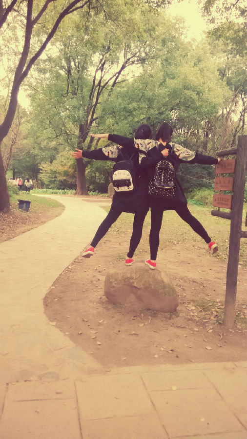 这是在今年秋游的时候拍的照片了,我和我的小伙伴一起买的一样的衣服一样的鞋子,我们的关系很好啊!在秋游那天回头率很高,有的人还问我们是不是双胞胎,我们笑着和别人说是,哈哈,有的人说在一起久了动作行为就会受另一个人影响,估计她受我的影响了吧!秋游那天我们拍了许多照片,这张是我喜欢的照片之一!希望我俩的友谊会长存!